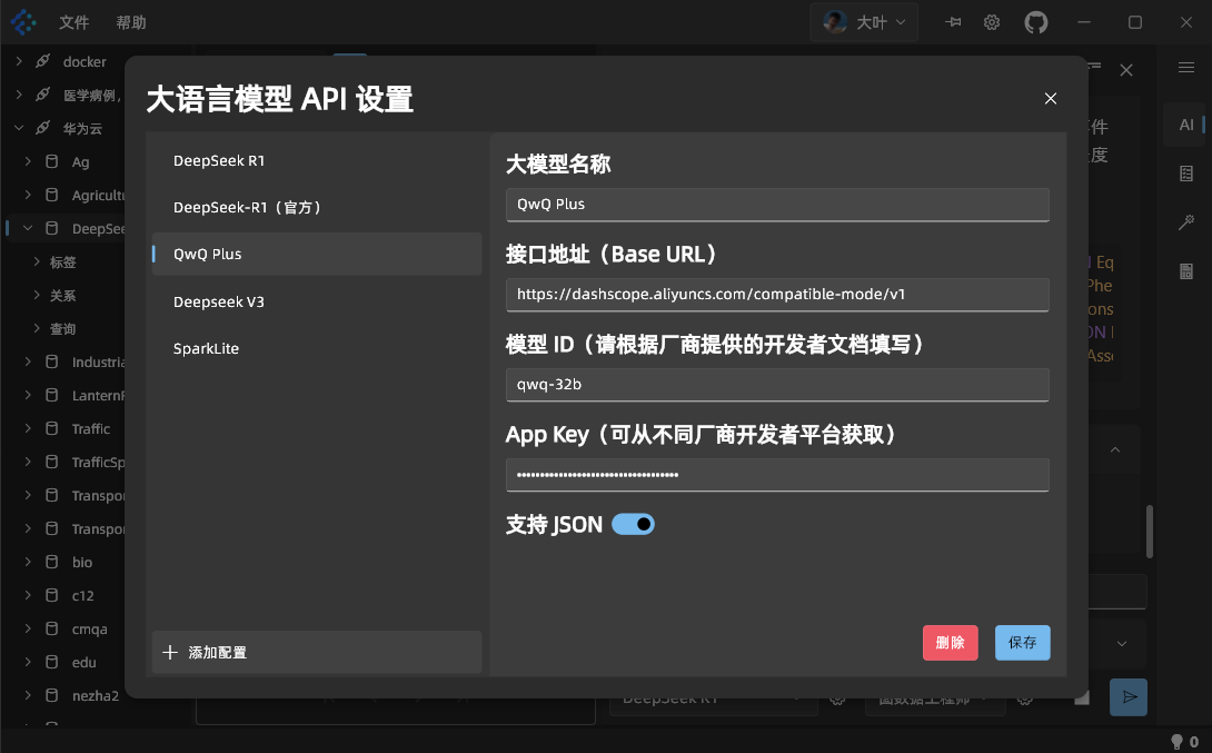 客户端集成了 AI 大模型,内置阿里云百炼的 DeepSeek-R1 模型及 ApiKey 以使得用户可以快速借助 AI 上手使用。示例如图: